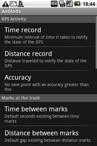 Desde las opciones de AndAndo es posible definir la distancia entre marcas, la precisión del tiempo de ruta y otras posibilidades como activar o desactivar el vibrador o los sonidos de aviso.